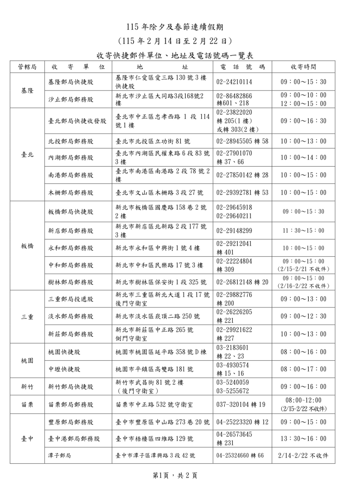 115年2月14日至2月22日春節連續假期,各地郵局營業窗口僅臺北故宮郵局營業,提供外幣兌換、各類集郵票品與代售商品販售服務,其餘郵局一律停止營業。