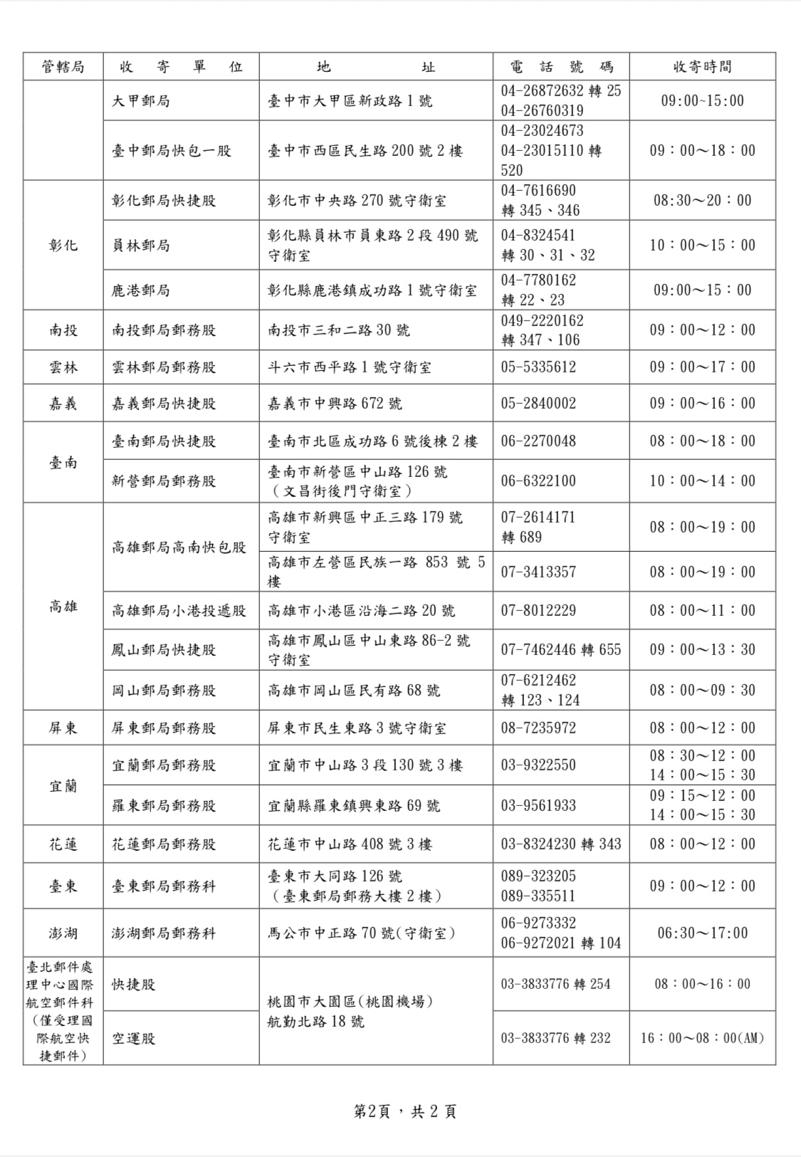 連續假期期間停止收攬信筒(箱)郵件及投遞包裹、限時、普通郵件,惟為因應顧客交寄快捷郵件需求,仍照常投遞快捷郵件,並開放全臺郵局郵務科(快捷股、郵務股或投遞股)及駐有守衛或保全之郵局(郵務股),收寄國內、國際快捷郵件;另臺北郵件處理中心航郵科國際快捷郵件股及空運股(地址:桃園市大園區航勤北路18號),亦提供收寄國際快捷郵件服務。因美國、加拿大、歐盟27國、英國、瑞士、挪威、香港、日本、澳大利亞、紐西蘭、韓國、印尼、馬來西亞、巴西、約旦、南非、印度、白俄羅斯、蒙古、越南、泰國及阿根廷郵政強制要求傳遞電子通關資訊(ITMATT),寄往上述國家、地區(美國可寄送「100美元(含)以下之非商業性禮品」及「書籍」)之國際快捷郵件請於營業日再至各局交寄。