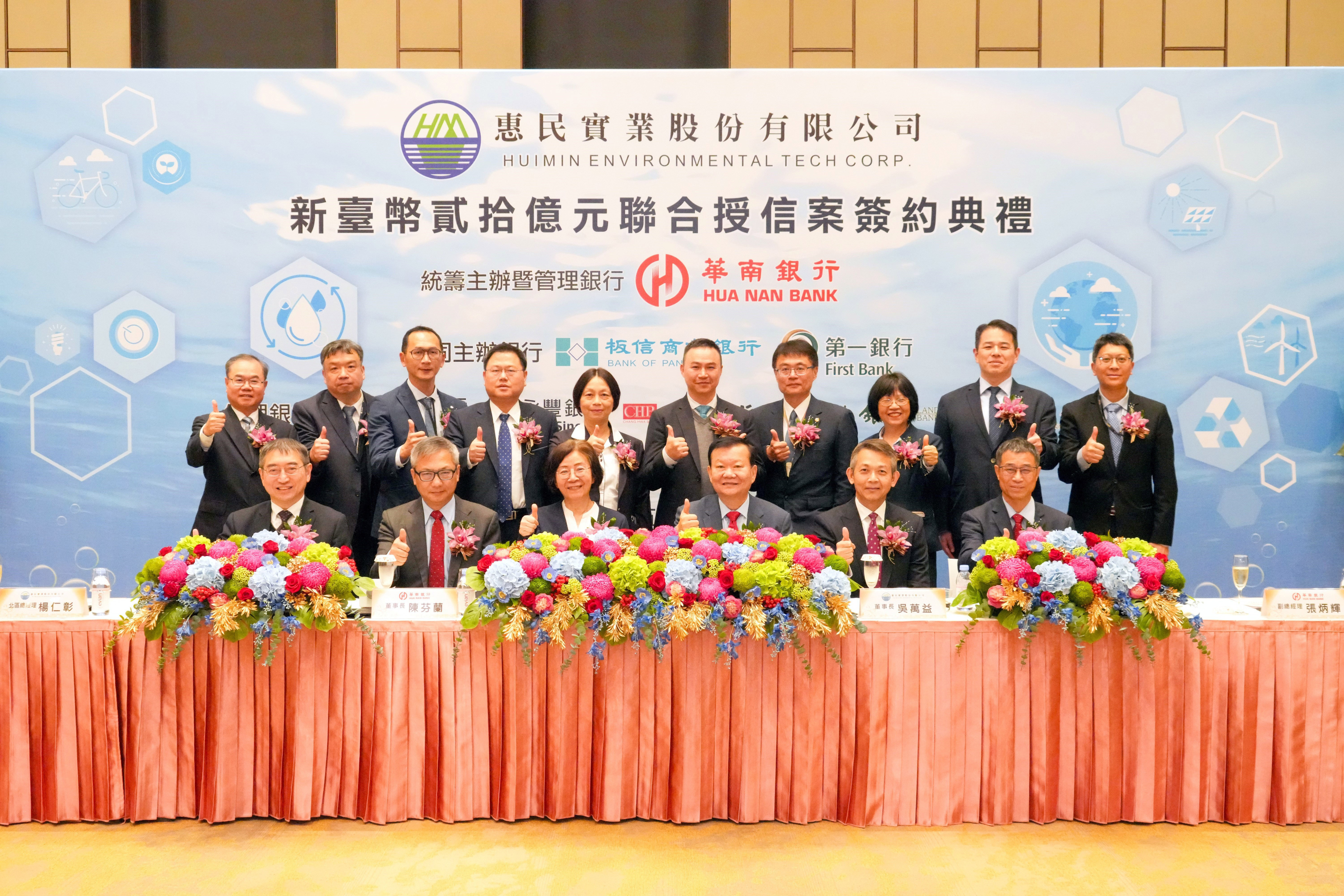 華南銀行統籌主辦惠民實業股份有限公司新臺幣20億元聯貸案,於日前完成簽約,為台灣循環經濟的發展挹注動能。這次聯貸案由華南銀行擔任統籌主辦銀行,並邀請板信銀行、第一銀行、兆豐銀行、永豐銀行、彰化銀行、土地銀行、高雄銀行、合作金庫及將來銀行等金融機構共同參與,全案以新臺幣16億元推出,在各家銀行踴躍支持下,超額認貸達1.37倍,最終以新臺幣20億元結案,充分顯見銀行團對於惠民實業的經營績效及未來發展給予高度認同與肯定。