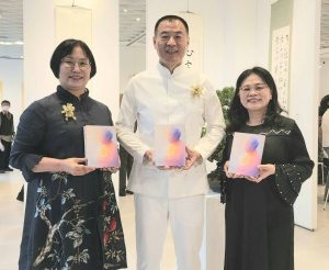 圖說:和氣大愛文教基金會創辦人周瑞宏在開幕式上致詞時表示,他看到現場展出的作品十分感動,強調發揚以中華文化為核心本質的重要性。(記者 鄭夢華拍攝,下同)